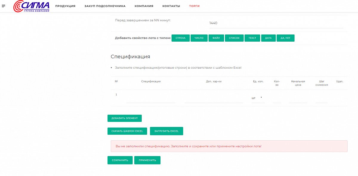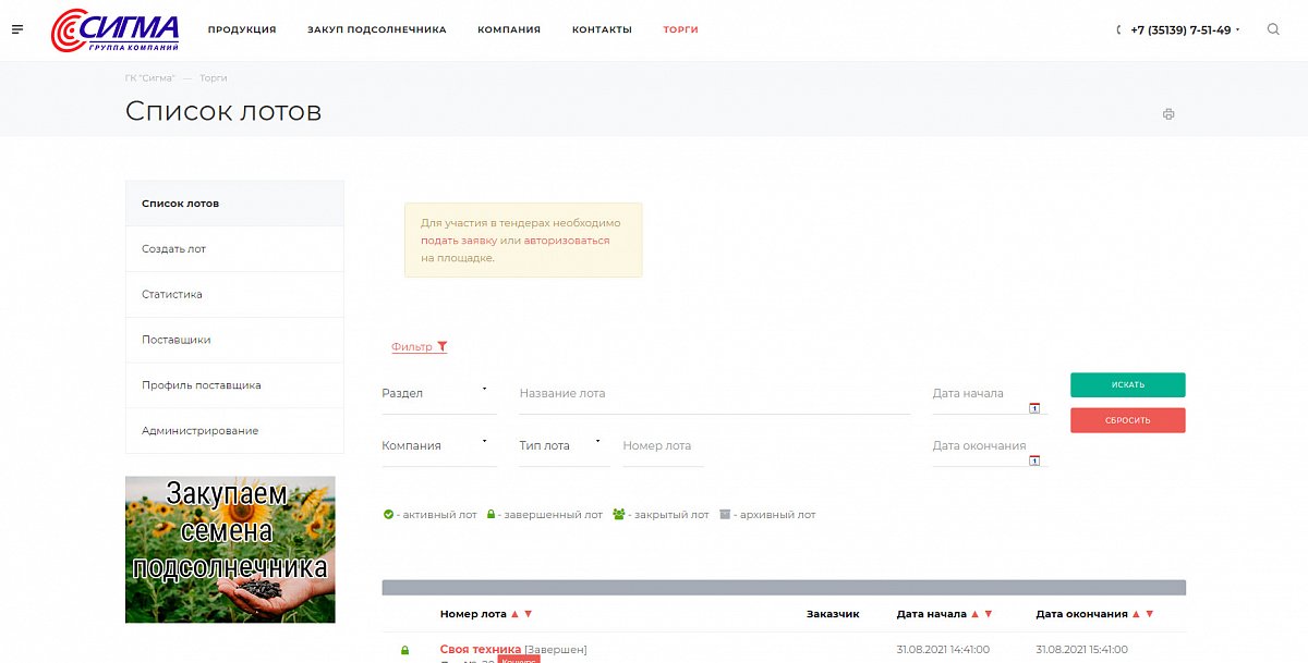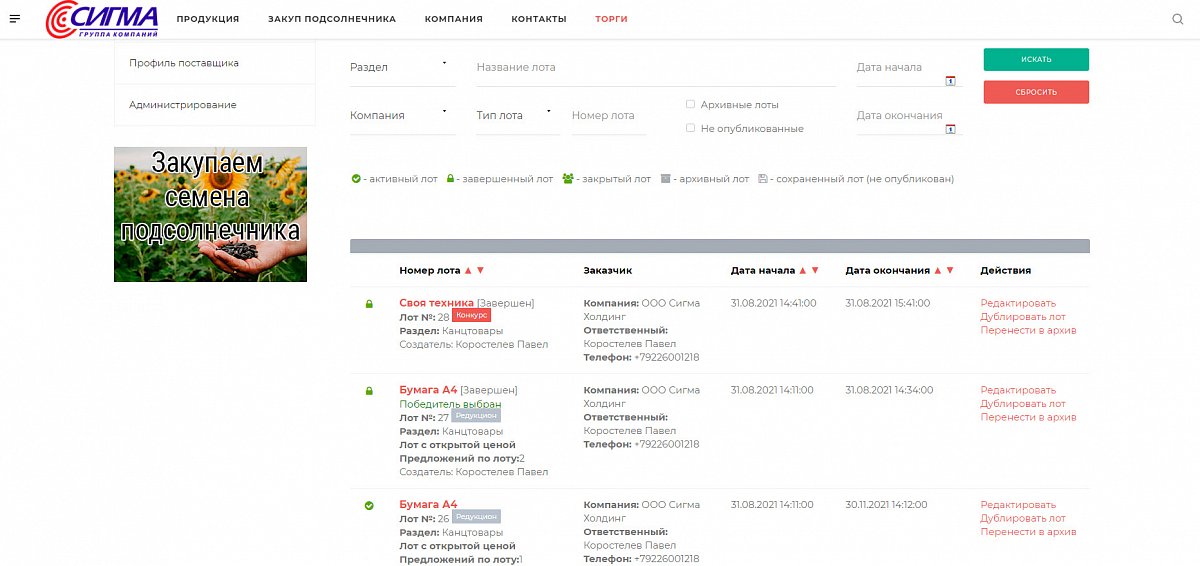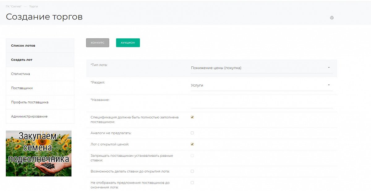 Создана и интегрирована в сайт собственная торговая площадка, поддерживаются как аукционы, так и конкурсы.